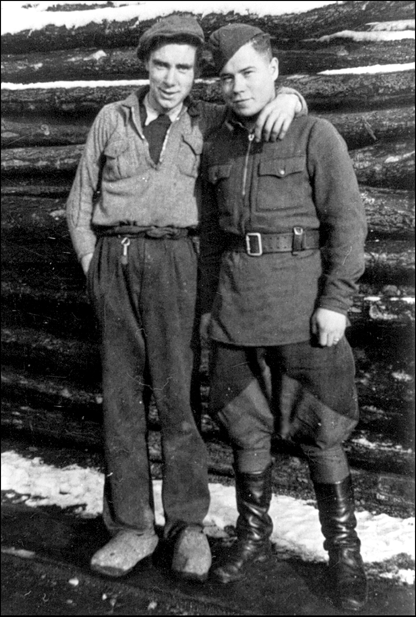 Hij heette Peter. Dat was mijne beste kameraad. Hij was geleerd, hij kende verschillende talen. Hij sprak ook Vlaams, wel een beetje gebroken. Het was ne chique type. En beleefd dat die was! Niet te geloven. Ik legde mijn hand in zijne nek, maar dat zou hij nooit bij mij gedaan hebben. Nee, dat deed hij niet. Dat er toen armoede was, is op de foto goed te zien. Ik had een vest aan met kapotte mouwen. En ik liep op klompen. Peter was beter gekleed dan ik.