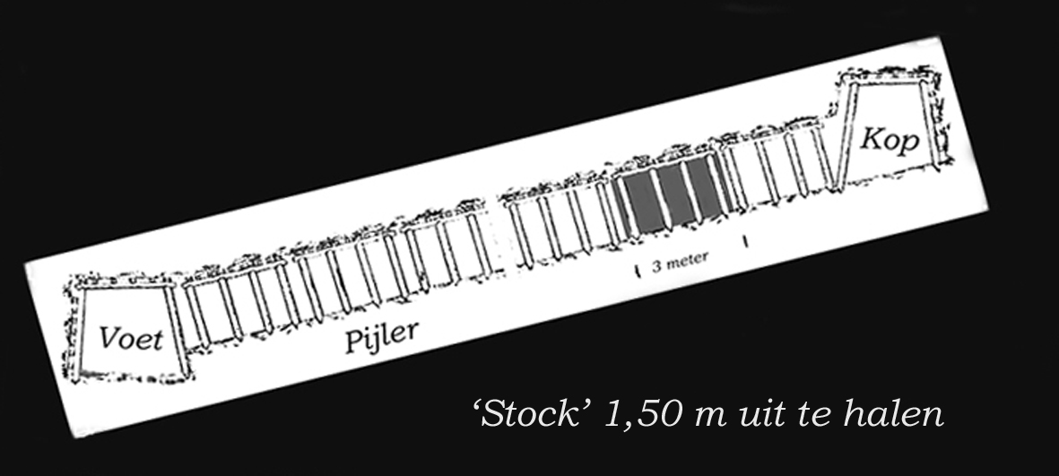 Iedereen naar zijn stock ~ Aan de voet van de pijler verdween de kolenhouwer in het donkere gat. Al kruipend moest hij bij zijn stock geraken. De omlegpost had de schudgoot tot haast tegen de kolenwand verlegd. Mannen van de nachtploeg hadden het gedeelte dat achter de stempels was vrijgekomen, opgevuld of laten instorten.