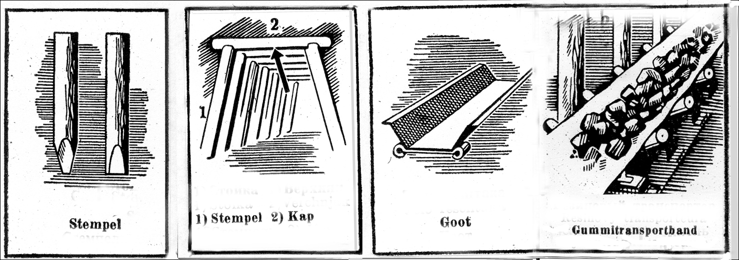 Vanboven gooiden manoeuvers het hout in de bak en dat kwam djoek… djoek… djoek…, meegeschud. Ge pakte zo ne waat van 1 m 50 uit de schudgoot en ge pakte ne stempel. Dat kophout diende als bescherming om het dak te ondersteunen. Was de stempel te lang, dan moest ge met uwe pikeur een kotje in den dij steken, zodat de stempel paste en ge klopte die met de pik aan. Als de stempel kon staan en vanboven die kap erin ging, werd er verder gewerkt, meestal van onder naar boven. De kool die viel moest ook weggeschupt worden. Dat moest ge zelf doen. Ge waart bevriend met elkander. Gewoonlijk, als we plaats hadden zodat we goed konden werken, werkte ik samen met de man die naast me zat; de ene pikeurde en de andere schupte.