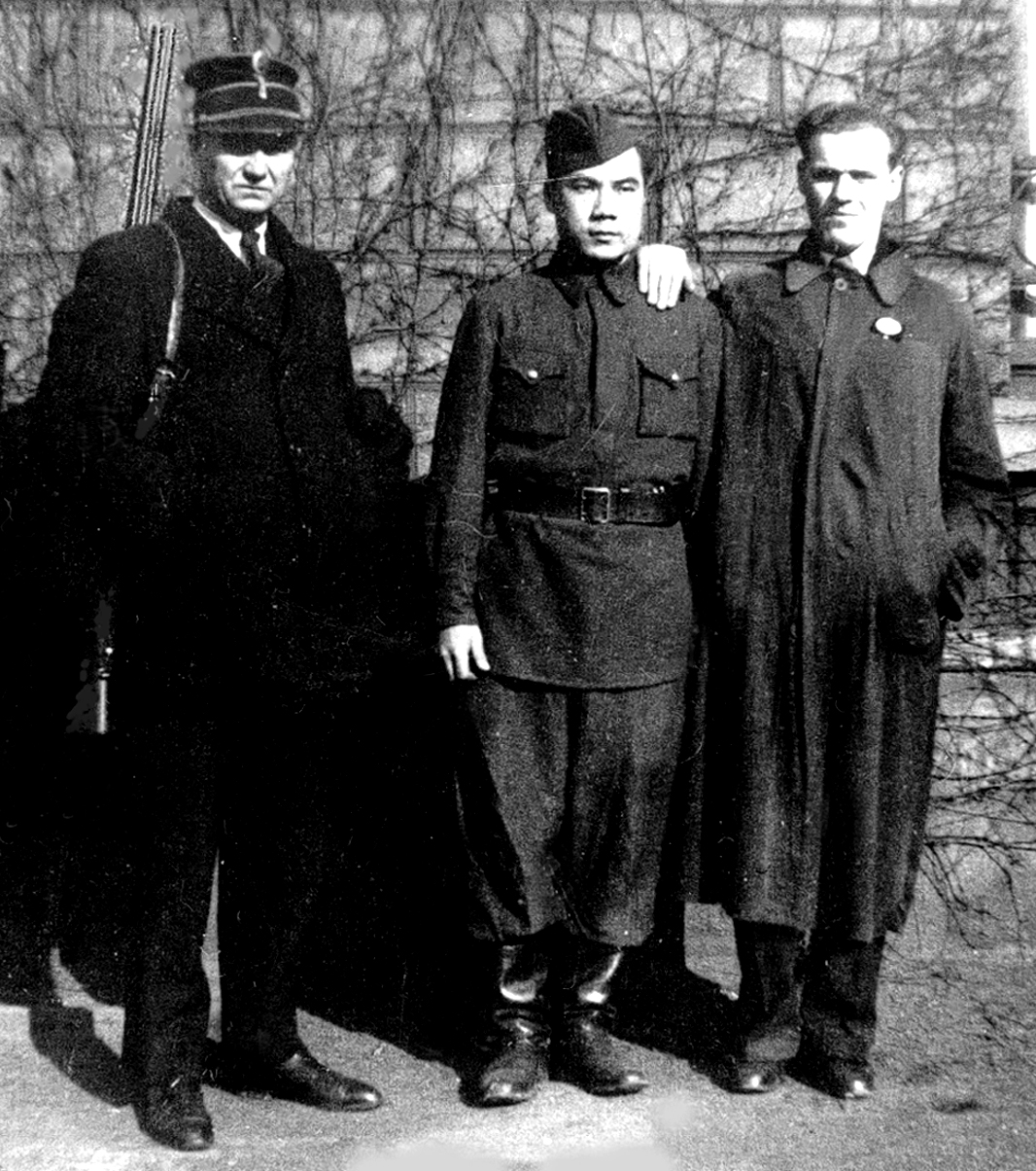 Mijnwachters met jachtgeweren ~ Niemand mocht zonder speciale vergunning een wapen bezitten. Wie de wet overtrad, riskeerde de doodstraf. De jacht was verboden en met tegenzin leverden de jagers hun tweeloop in.